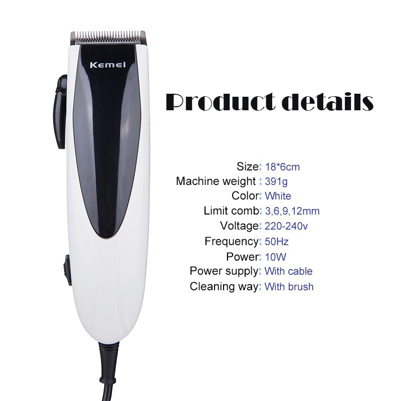 Kemei Professional Clipper Electric Shaver Trimmer Men Pakistan. Fine tuning knob: 4 combs to adjust(0.8-2.0mm), control the length of the hair, meet your different need. Adjustable limit comb, can be adjusted to 3mm, 6mm, 9mm and 12mm, let you easily to create your hair style. It is powered by cable, can provide 10W power. The whole product is not waterproof.