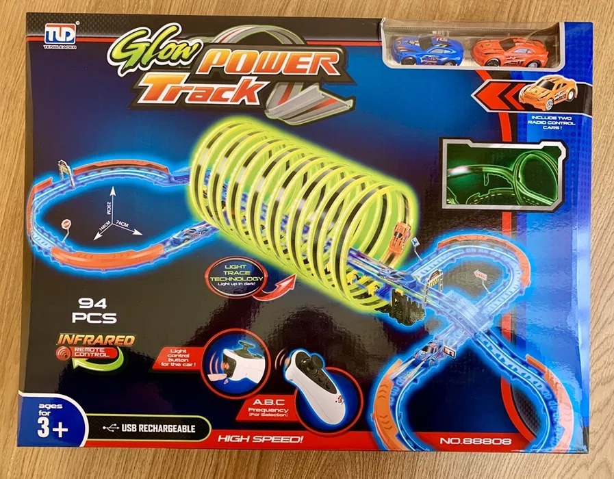 - GLOW IN THE DARK: The track’s neon colors shine super bright